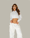 Camisa Aur cropped blanca de manga larga y cuello clásico, con elástico en la cintura que define la silueta y aportan un toque femenina.