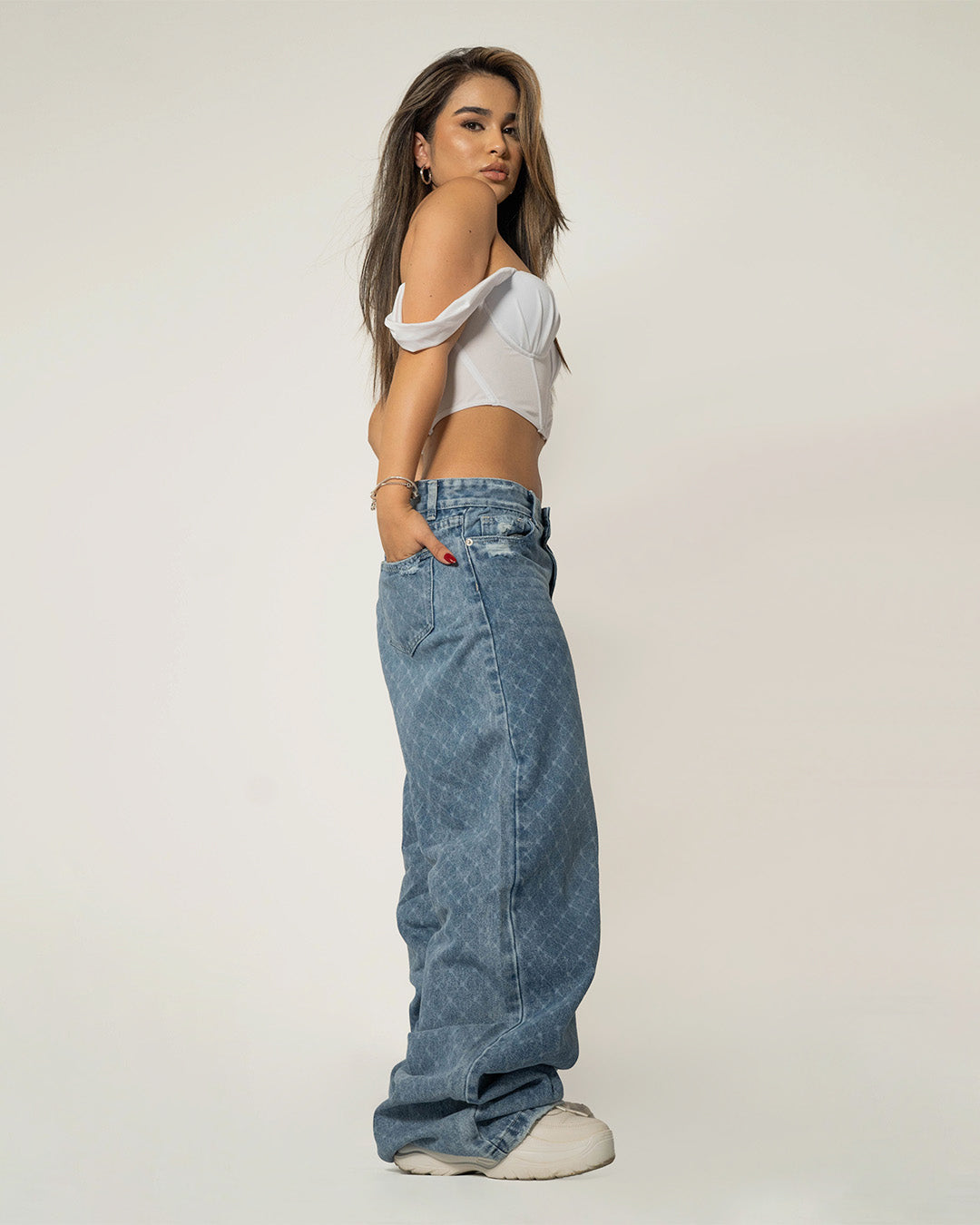schoulder, acompañado de jeans anchos con textura sutil en rombos.